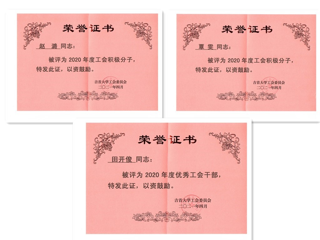 学院田开俊老师获2020年度优秀工会干部;覃雯、赵潞两位老师被评为2020年度工会积极分子。