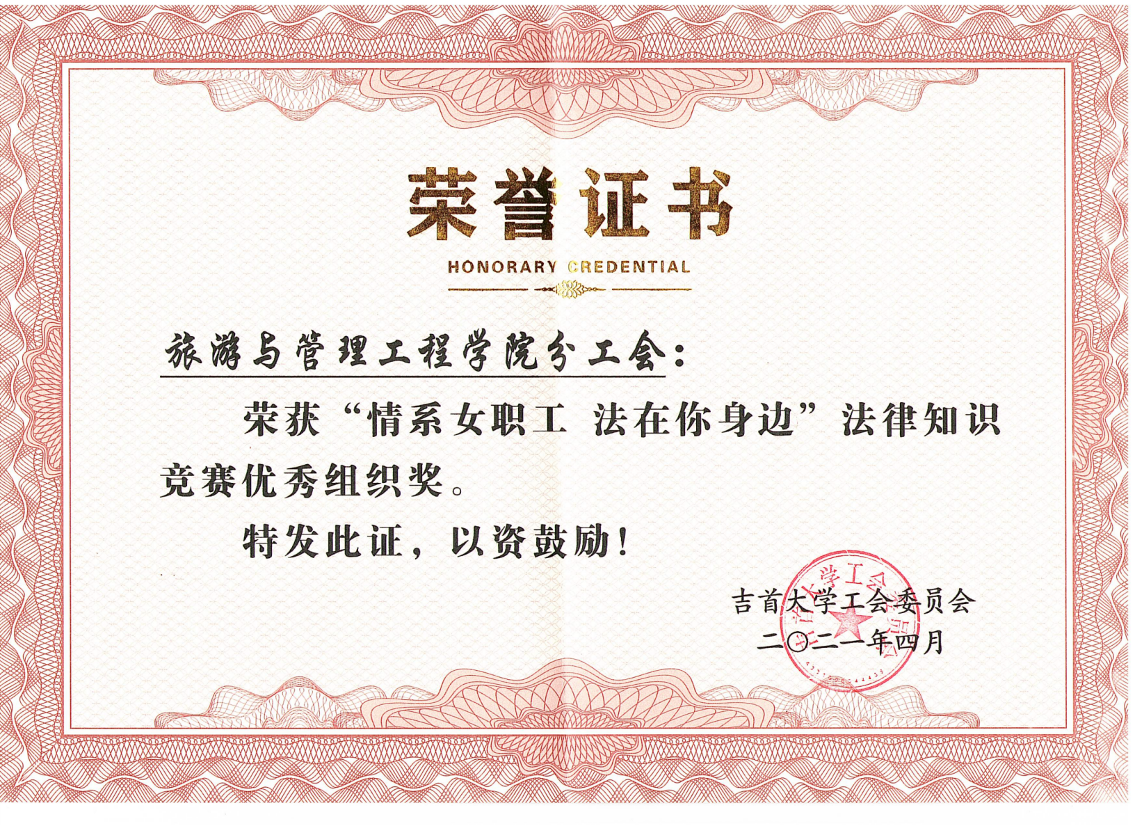 4月28日,在williamhill中国庆祝“五一”国际劳动节工会工作表彰会上,旅游与管理工程学院分工会荣获“情系女职工 法在你身边”法律知识竞赛优秀组织奖。