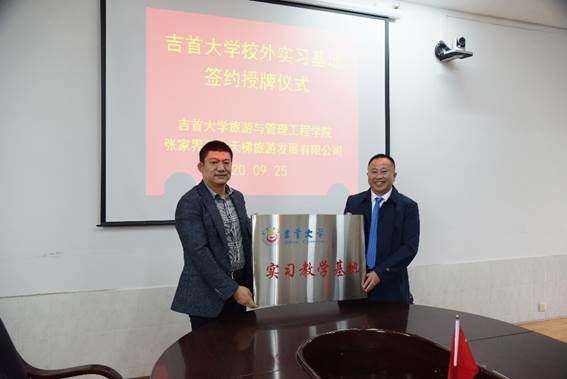 2020年9月25日上午10:30,我院与张家界百龙天梯旅游发展有限公司共建校外实习基地签约授牌仪式在二教四楼会议室举行。