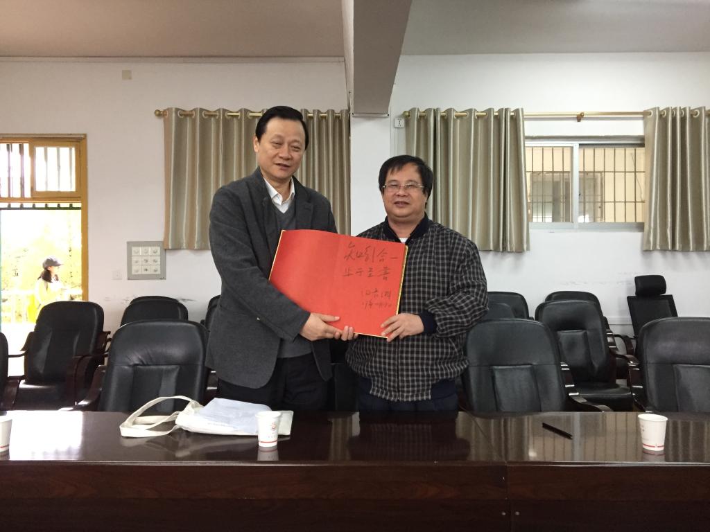| 白晋湘校长(左一)为学院题字并与尹华光院长(右一)合影 |