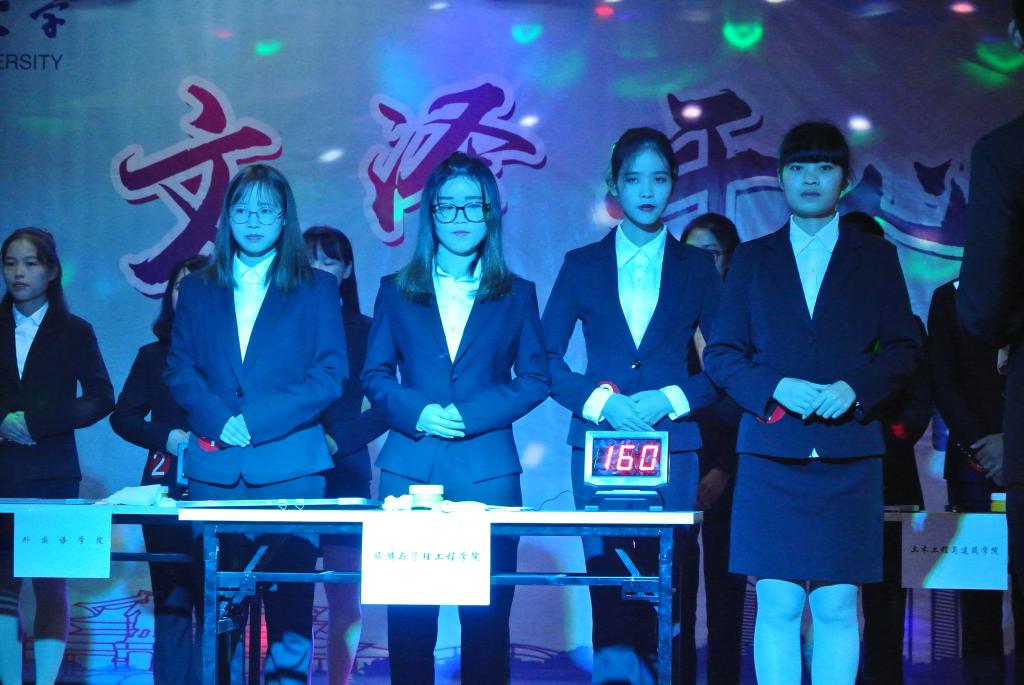 首先,由吴永江书记致辞,接着,在主持人慷慨激昂的开场词中,各院参赛选手们陆续走上了舞台,此次活动的参赛者分别由来自6个学院的24位选手组成,来自各院的参赛选手们,都对自己充满了信心,也都希望能在此次比赛中获得佳绩。在第一轮的单选题和填空题中,各院均发挥优秀,赢得了满堂喝彩。经过十分钟的休息后,最令人期待,同时也是最让人为之紧张的抢答赛开始了。台上,选手们神色严峻,等待抢答;台下,观众们屏气凝神,静心观赛。抢答赛的进行,将气氛带到了全场最高潮,观众们都为选手捏了一把汗,在这之后的问答题中,更是表现精彩。选手们旗鼓相当,战况激烈,因此还举行了激动人心的加时赛。