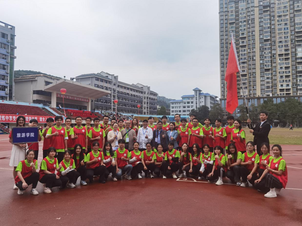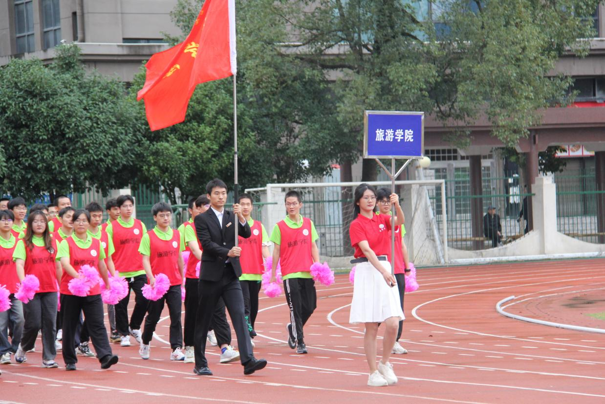 旅游院的运动健儿们,脚步坚定、精神饱满地朝主席台走来。他们大声呼喊着:“以人名校,以业报国,凤飞千仞,薪传八方,知行合一,止于至善伴旅天下,立德成才”的口号。旅游学院学子展现了自信团结的旅院风采。