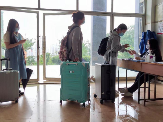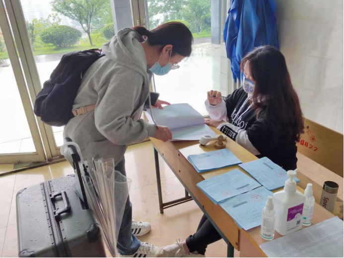 夏雨绵绵,风雨交加,毕业生们配合着各环节的要求,陆续完成行李消毒、体温检测、健康码行程卡查验、报到证和就业协议领取等一系列流程。坚守在工作岗位的志愿者们工作细致,用行动践行责任,为毕业生提供贴心、便利的服务。