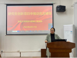 2022年4月17日上午10点30分,旅游与管理工程学院科研创新项目申报动员及辅导会在2312教室举行。本次会议是学院副院长粟娟教授主持,采用线上、线下相结合的方式同时进行,2021级旅游管理专业全体同学参加了此次会议。