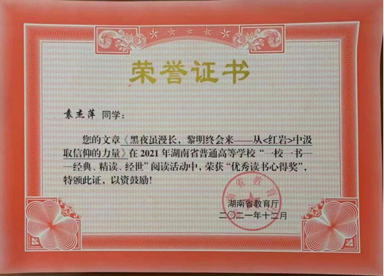 近日,湖南省教育厅下发了《关于2021 年全省普通高等学校“一校一书”阅读推广活动评选结果的通报》,我院2020级图书情报研究生袁杰萍荣获优秀读书心得奖。